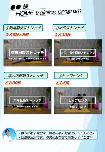 あなたの問題点を徹底的に分析し、あなたに合った完全オーダーメードの施術・トレーニングで、痛みに邪魔されない身体を作ります。病院のリハビリテーション現場で培った医学的な知識・技術と、スポーツ現場で培った、身体の柔軟性や筋力を高めるトレーニングを融合させ、科学的根拠に基づいた、あなただけの特別プログラムです。